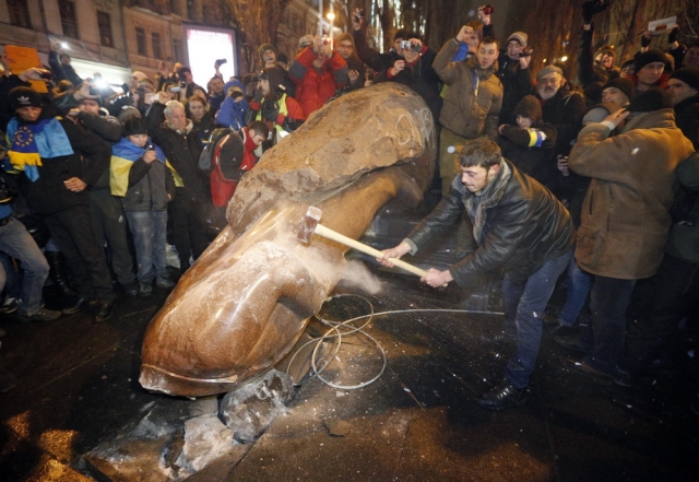 Статуята е била съборена от маскирани демонстранти, които развявали знамена на националистическата партия "Свобода".