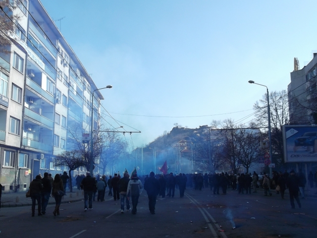 Постепенно протестът ескалира. Шествието тръгна от съда през Главната и се насочи към Джумая джамия. Бомбички, димки и камъни полетяха към историческия паметник.
