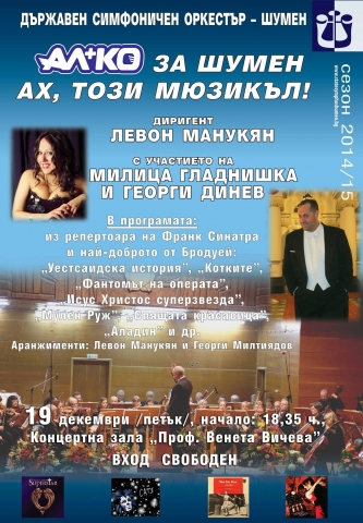 „Ал и Ко“ и симфоничният оркестър канят шуменци на Коледен концерт „Ах, този мюзикъл, който ще се проведе на 19 декември, от 18,35 ч., в концертната зала „Проф. Венета Вичева”.