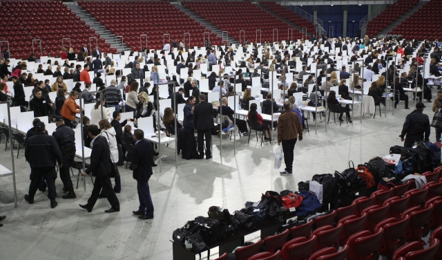 Чиновете за кандидатите бяха разположени върху игрището на най-голямата спортна зала у нас, като всеки от тях бе отделен с прегради от съседните като мярка срещу преписване. Допускането в залата мина при строги мерки за сигурност и засилена охрана.