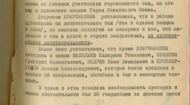 "В разпитите на Добробавин бе установено, че той е бил в района на село Дубосеково (където се е предал на немците), но никакви подвизи не е извършвал и всичко, написано за него в книгата на героите панфиловци, не съответства на действителността", пише още в началото на доклада. Веднага след това се посочва, че е било установено, че още четирима от "загиналите" панфиловци са живи.