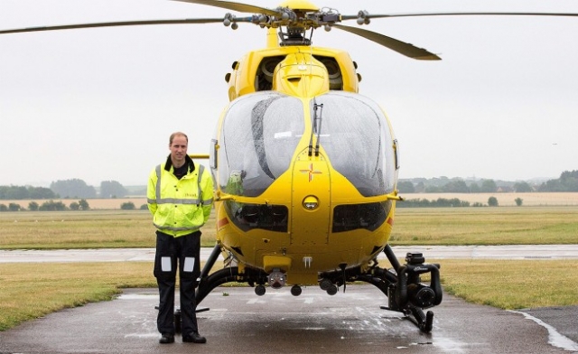 На снимката представителят на кралското семейство ясно се вижда на фона на жълт хеликоптер „Юрокоптър И Си 145“ (Eurocopter EC145), чието управление той пое в средата на този месец.