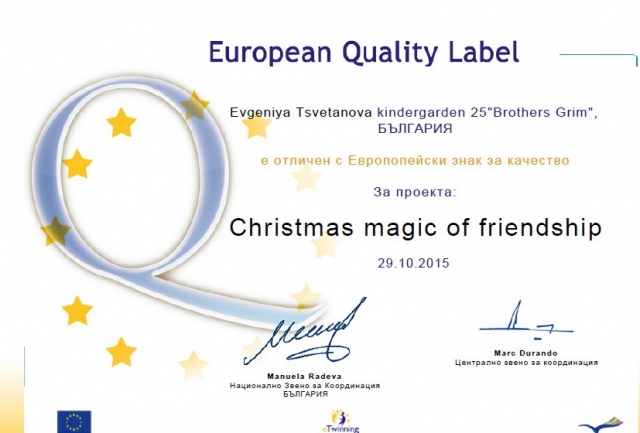 Той е за работа по проекта "Коледна магия на приятелството", който бе осъществен от ноември 2014 до януари 2015 г. с учители и деца от детска градина № 207 "Синьо цвете" в Букурещ, Румъния. Идеята на проекта бе чрез различни дейности децата да научат повече за Коледа и да станат приятели.