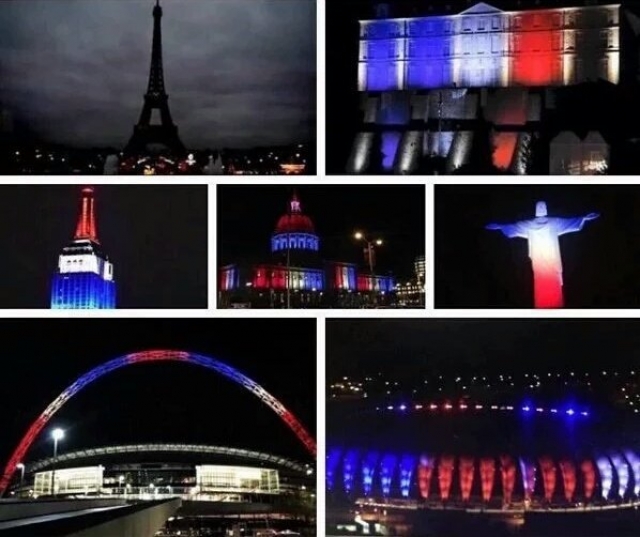 Френският трикольор е на Операта в Сидни, статуята на Исус Христос над Рио де Жанейро, парламентът в Атина, Емпайър стейт билдинг в Ню Йорк и др.