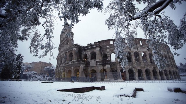В Рим бяха затворени всички училища и най-известният паметник на града след падането на първия сняг от 2012 г. Колизеят - най-посещаваният туристически обект в Италия, беше затворен наред с намиращия се наблизо Римски форум и Палатинския хълм, а властите призоваха хората да не излизат от домовете си, ако не се налага. В резултат улиците бяха необичайно тихи, а хората снимаха необикновената метеорологична обстановка. Снегът засегна и градския транспорт и наруши движението на влаковете.