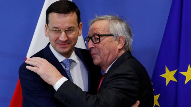 Моравецки разговаря с председателя на Европейската комисия Жан-Клод Юнкер. Това е поредната среща на високо ниво през последните месеци, целяща да разреши спора между ЕС и Полша за демокрацията в страната. Съдебната реформа в Полша предизвика критиките на ЕС, на активисти, международни организации и опозиционни партии, защото поставя съдилищата под по-голям правителствен контрол.