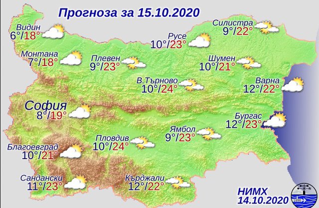 През нощта ще бъде предимно ясно и почти тихо. До сутринта на много места в низините и котловините ще се образува мъгла или ниска слоеста облачност. Минималните температури ще са предимно между 6° и 11°. Утре преди обяд в много райони ще остане мъгливо, но по-късно през деня мъглата ще се разсейва и над страната ще преобладава слънчево време с разкъсана средна и висока облачност. Ще духа слаб до умерен вятър от юг-югозапад, с него температурите ще се повишат и дневните ще са предимно между 19° и 24°, по-ниски в районите с по-трайна мъгла.