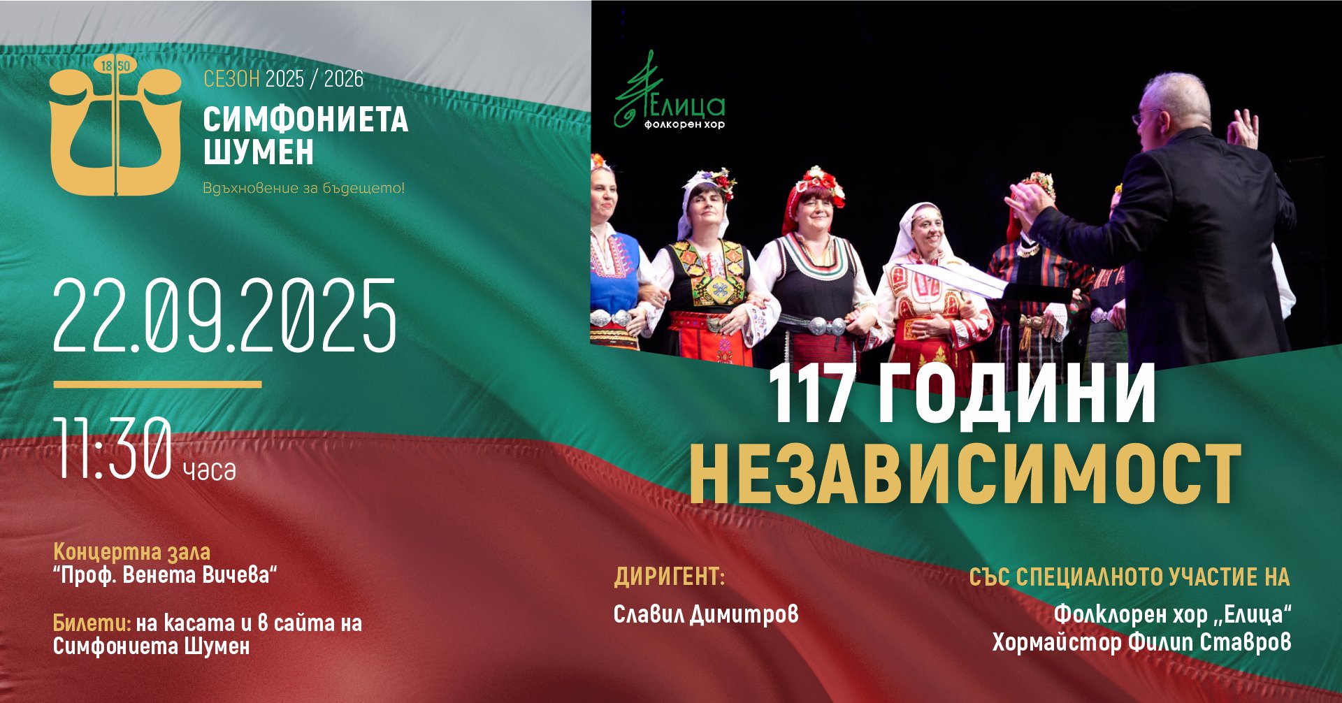 Симфониета Шумен ще поднесе специален концерт, посветен на Деня на независимостта. Той ще е на 22 септември от 11:30 ч. в Концертна зала „Проф. Венета Вичева“.