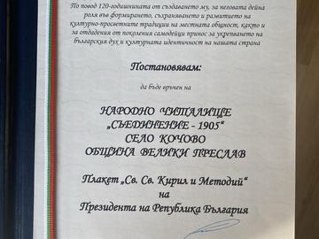 Народно читалище „Съединение–1905“, село Кочово, Община Велики Преслав отбеляза 120 години от създаването си и 140 години от Съединението на Княжество България и Източна Румелия.