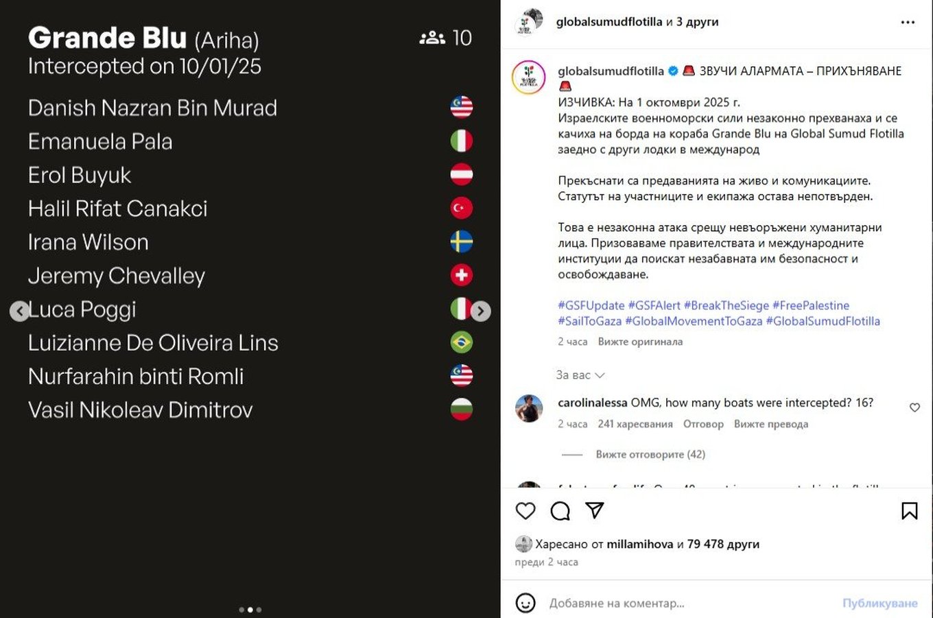 "Прекъснати са предаванията на живо и комуникациите. Статутът на участниците и екипажа остава непотвърден. Това е незаконна атака срещу невъоръжени хуманитарни лица. Призоваваме правителствата и международните институции да поискат незабавната им безопасност и освобождаване", написаха от globalsumudflotilla, които разпространиха кадрите.