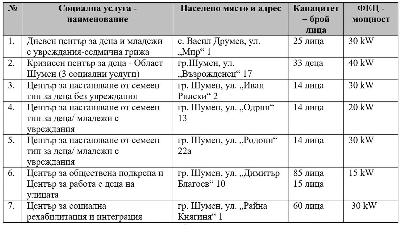 В резултат на проекта седем от десетте съществуващи социални услуги в община Шумен, делегирани от държавата дейности, ще постигнат икономия от около 50% на годишното си потребление на енергия, произведена от невъзобновяеми източници, казаха от Общината.