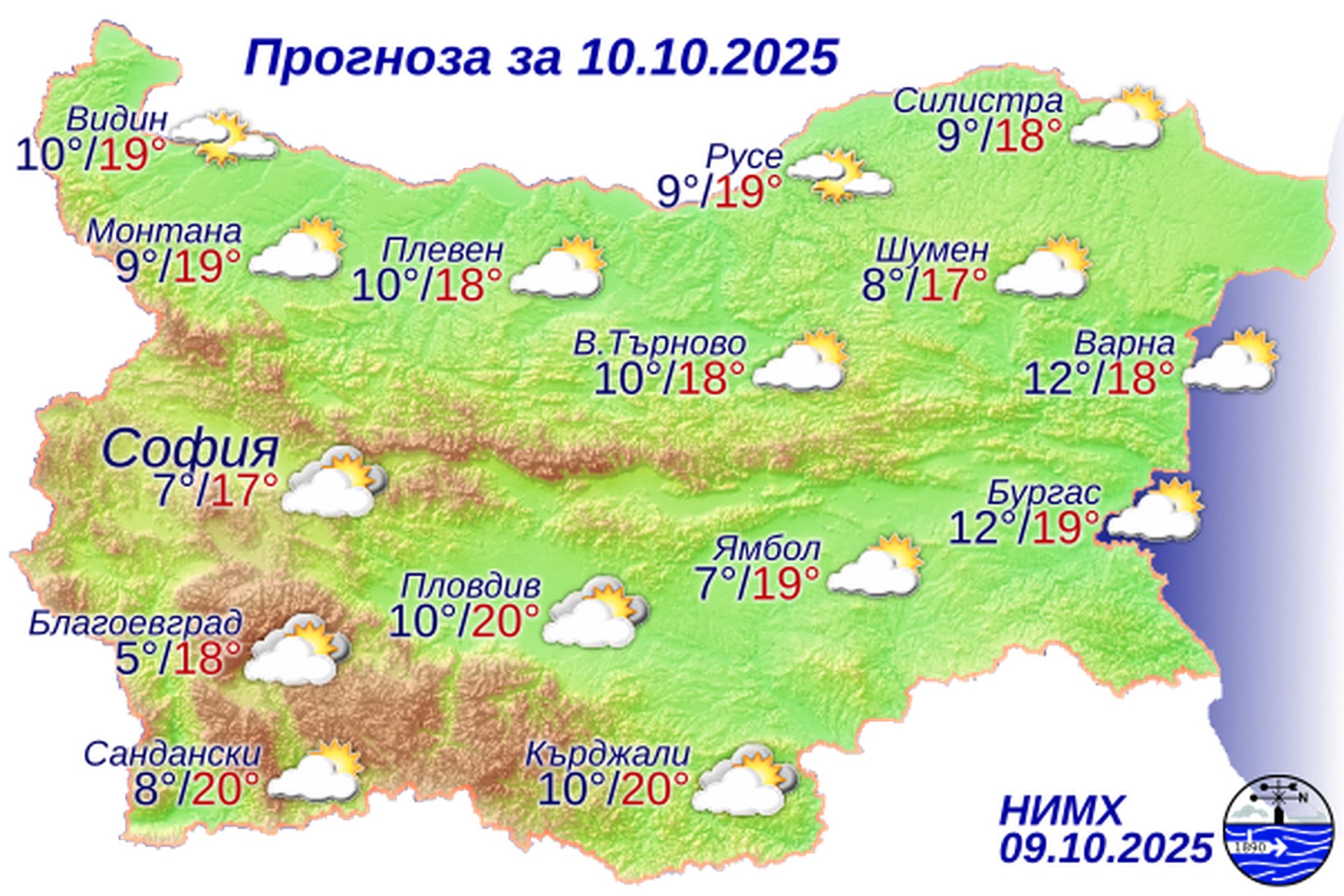 По Черноморието ще преобладава слънчево време, с временни увеличения на облачността. Ще духа умерен северозападен вятър. Максималните температури ще бъдат 18°-20°, колкото е и температурата на морската вода. Вълнението на морето ще бъде около 2 бала.