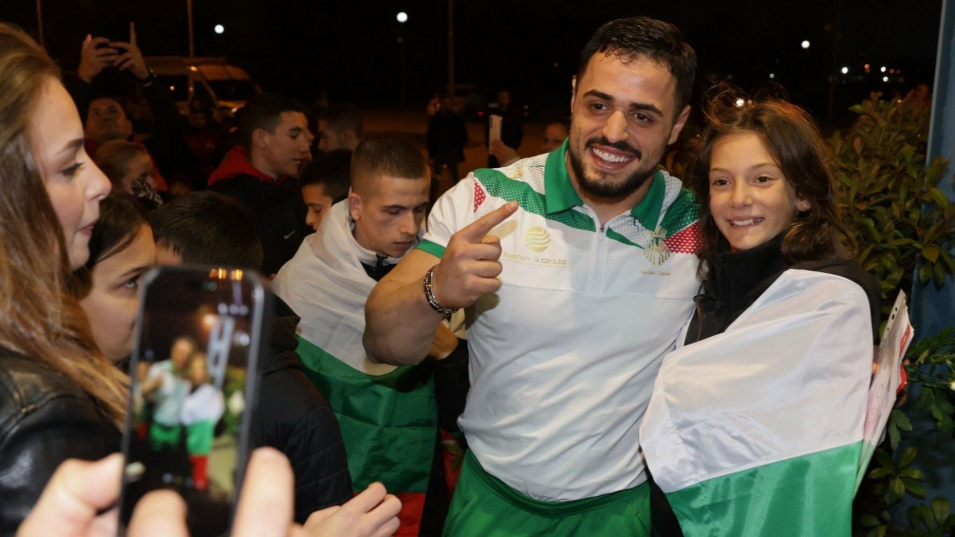 21-годишният тежкоатлет кацна на софийското летище с полет от Франкфурт, като още на пистата бе посрещнат от най-близките си хора - майка си и приятелката си, както и от група с народни носии и изпълнение на гайди.