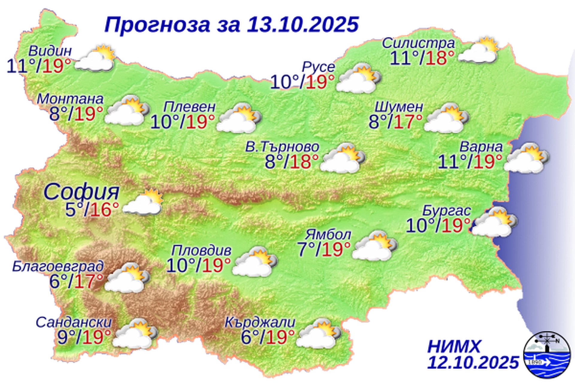 Над Черноморието сутринта ще бъде предимно слънчево, но още преди обяд облачността ще се увеличи. Ще духа слаб и умерен вятър от запад-северозапад. Максималните температури ще бъдат 17°-19°. Температурата на морската вода е 18°-19°. Вълнението на морето ще бъде около 2 бала.