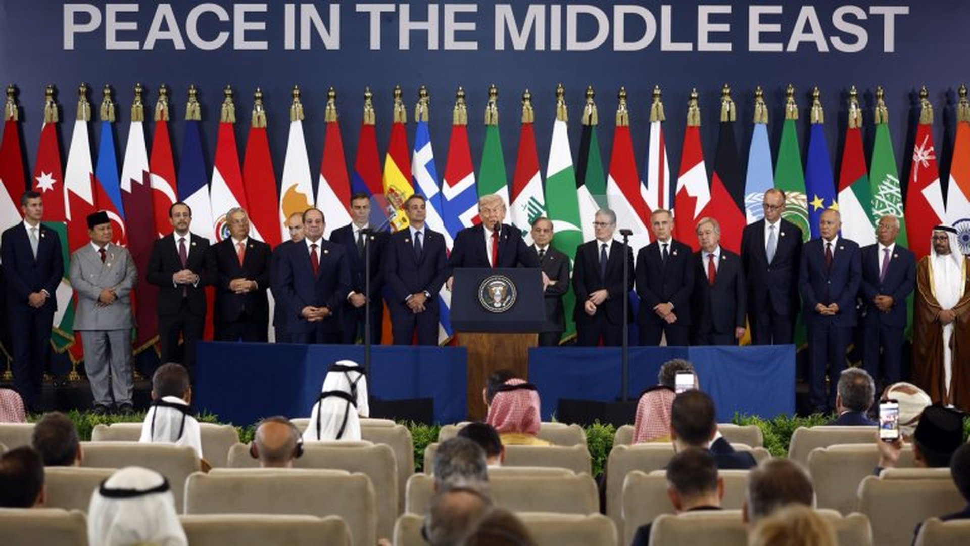 Зад Тръмп и арабските лидери бяха други световни политици, сред които германският канцлер Фридрих Мерц, британският премиер Киър Стармър, френският президент Еманюел Макрон и кралят на Йордания Абдула Втори.