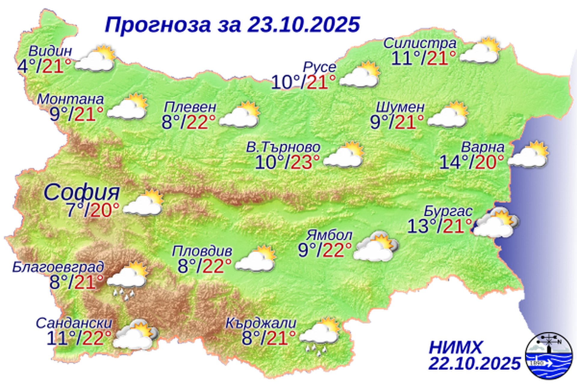 В сутрешните часове на места в низините ще се образува мъгла или ниска облачност. Ще духа слаб, през деня в Източна България и на север от планините – умерен юг-югозападен вятър. Ще продължи да се затопля и минималните температури ще бъдат между 6° и 11°, по Черноморието: 13°-16°; а максималните - между 18° и 23°. В София минималната температура ще е около 7°, максималната – около 20°. През нощта срещу петък от запад облачността бързо ще се увеличава и вплътнява.