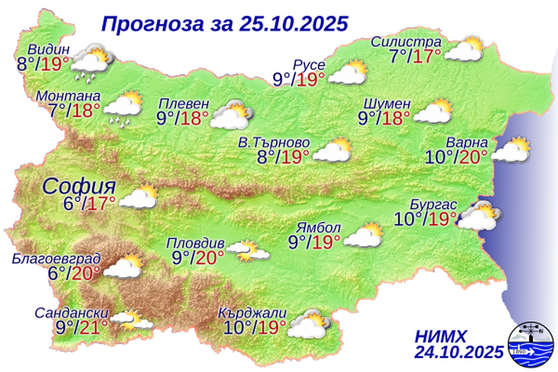 През нощта в по-голямата част от страната ще преобладава ясно време. Значителна ще е облачността над югоизточните райони, но и там ще се разкъсва и намалява. Ще духа слаб, в Източна България умерен вятър от запад-северозапад. Минималните температури ще бъдат между 6° и 11°, в София – около 6°. Утре след временно разкъсване и намаление, над Северна България облачността отново ще се увеличи и привечер и през нощта на места там ще има валежи. Временни увеличения на облачността ще има и над Родопите и югоизточните райони. В останалата част от страната ще има повече слънчеви часове. Ще духа слаб до умерен вятър от запад-югозапад. Максималните температури ще бъдат между 17° и 22°, в София – около 17°.