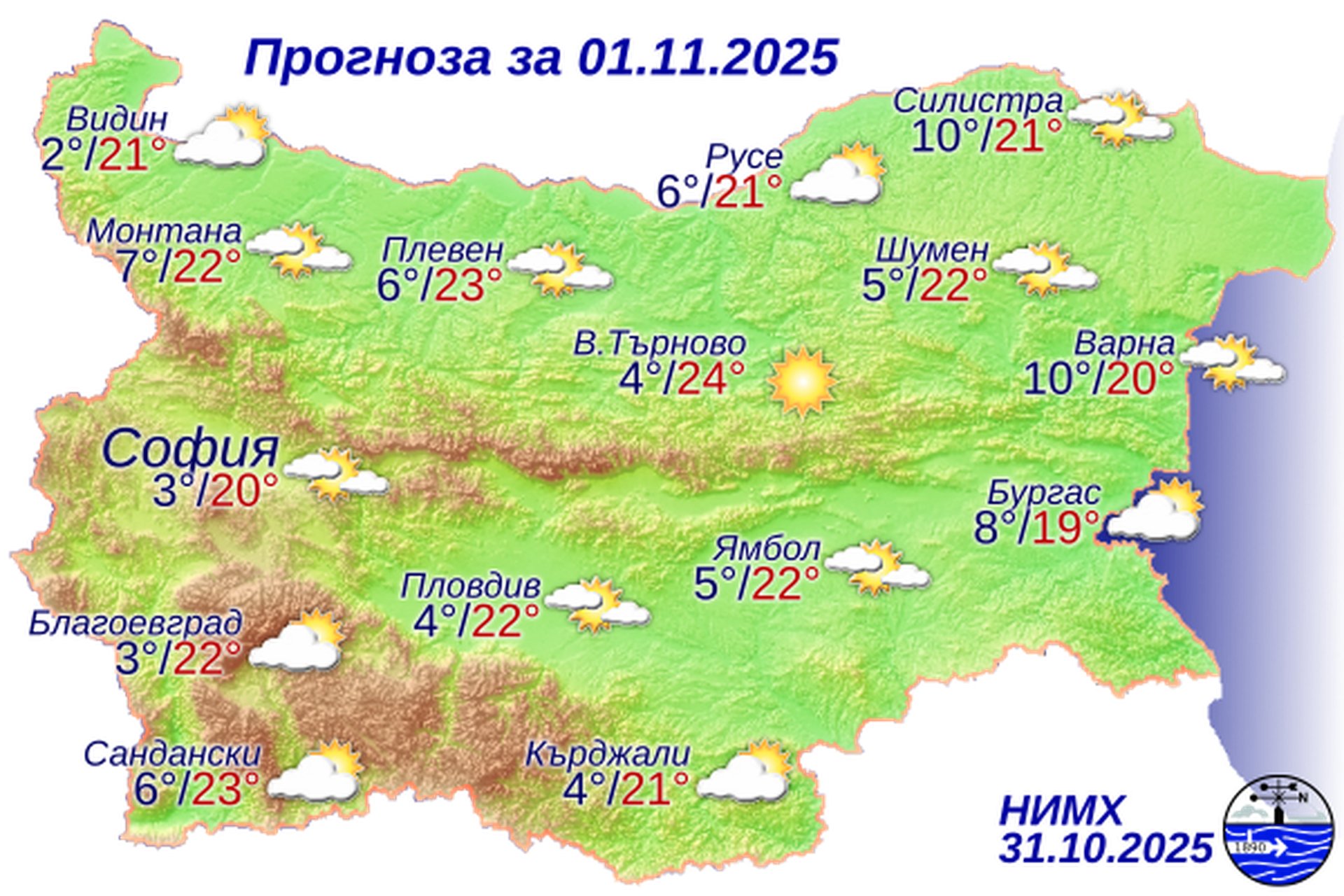 Утре ще е слънчево с разкъсана висока облачност, преди обяд на места в равнините ще има мъгла. Ще бъде почти тихо или със слаб вятър от югоизток. Максималните температури ще бъдат между 19° и 24°, в София – около 20°.