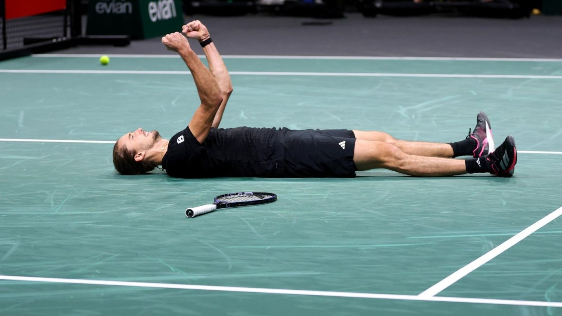 Александър Зверев е последният полуфиналист на Мастърс турнира по тенис в Париж, след като в късните часове на петък (и след полунощ у нас) легна на корта и отпразнува победа над Даниил Медведев - 2:6, 6:3, 7:6.