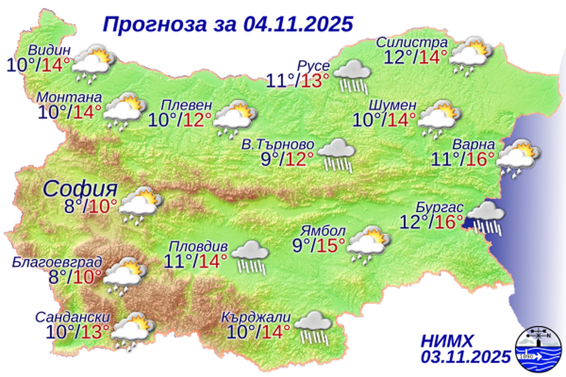 Утре ще се задържи облачно, на много места с валежи от дъжд, които от запад на изток ще спират. Ще духа умерен, в Дунавската равнина и Горнотракийската низина временно силен северозападен вятър. Максималните температури ще бъдат между 10° и 15°, в София - около 10°.