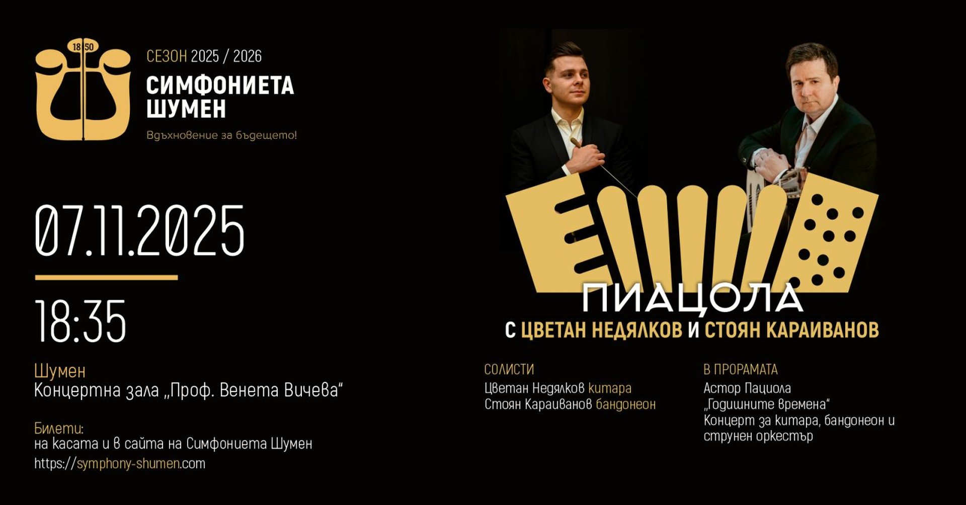 Симфониета Шумен представя „Пиацола“ с участието на изключителните солисти Цветан Недялков (китара) и Стоян Караиванов (бандонеон).