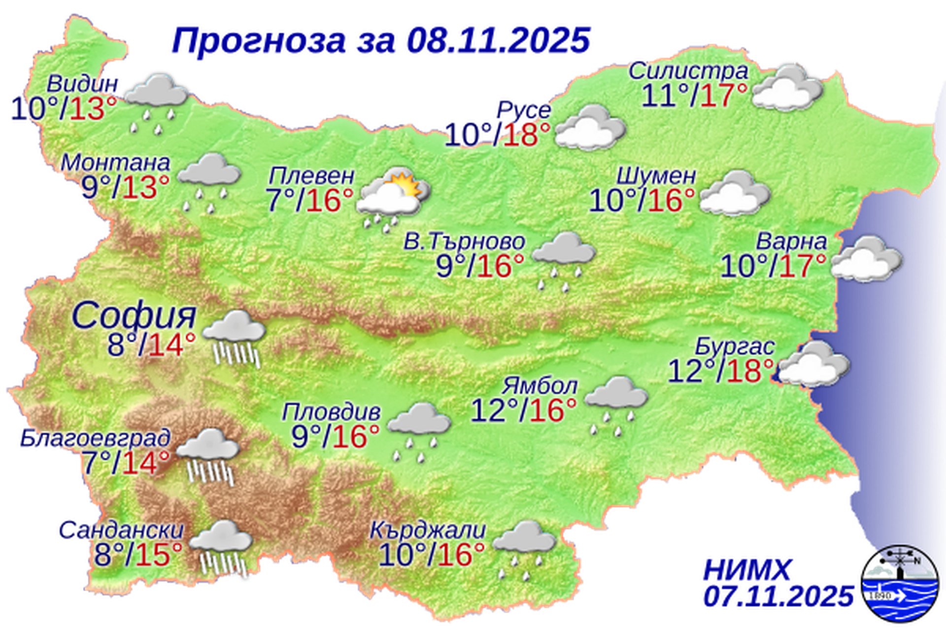 През нощта ще бъде облачно и на места в Горнотракийската низина и Северозападна България все още ще превалява дъжд. Ще духа слаб, в Дунавската равнина и Лудогорието, умерен вятър от изток-североизток. Минималните температури ще са между 7° и 12°, в София - около 8°. В сутрешните часове на места в равнините видимостта ще бъде намалена. Преди обяд валежите временно ще спрат. През втората половина на деня от запад на изток отново ще има валежи от дъжд. На места в югозападната половина от страната количествата ще са значителни. Ще духа до умерен вятър от юг-югоизток. Максималните температури ще са между 13° и 18°.