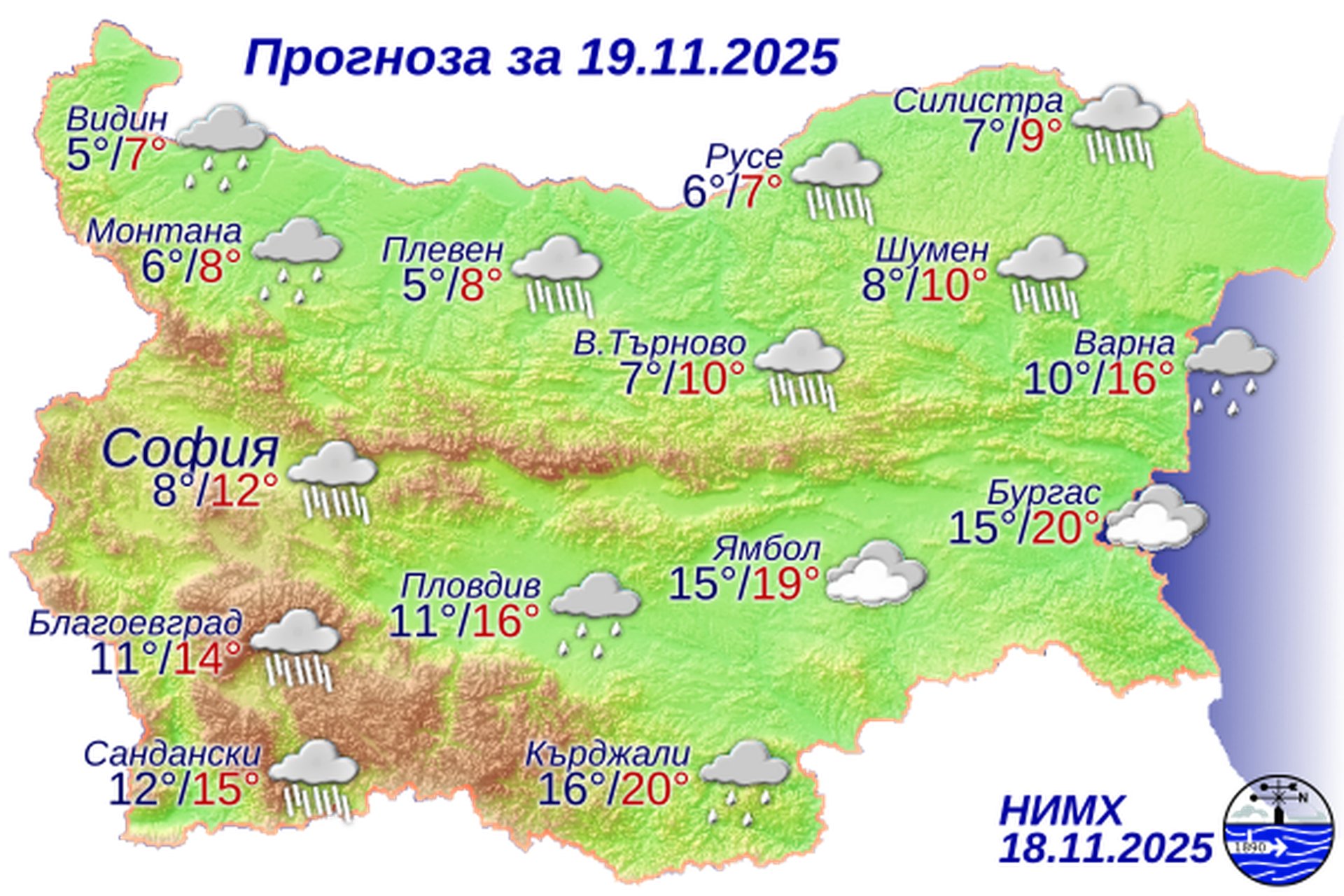 Вятърът ще отслабне и ще се ориентира от север-североизток. В Южна България ще остане от юг-югозапад, ще е умерен, в югоизточните райони и северно от планините - временно силен и поривист. Тaм и температурите ще останат по-високи: минималните ще са между 12° и 17°, а максималните – между 16° и 21°. В останалата част от страната минималните температури ще бъдат между 5° и 10°, а максималните – от 7°-9° в северозападните райони до 13°-15° в югозападните.
