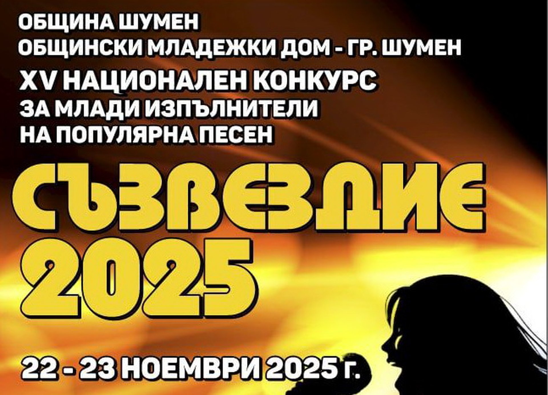 Над 150 изпълнители от водещи музикални школи с традиции във вокалното изкуство, вокални студия и арт центрове от страната ще се представят на сцената на ХV Национален конкурс за млади изпълнители на популярна песен „Съзвездие“ 2025, който ще се проведе на 22 и 23 ноември 2025 година в Младежки дом в Шумен.
