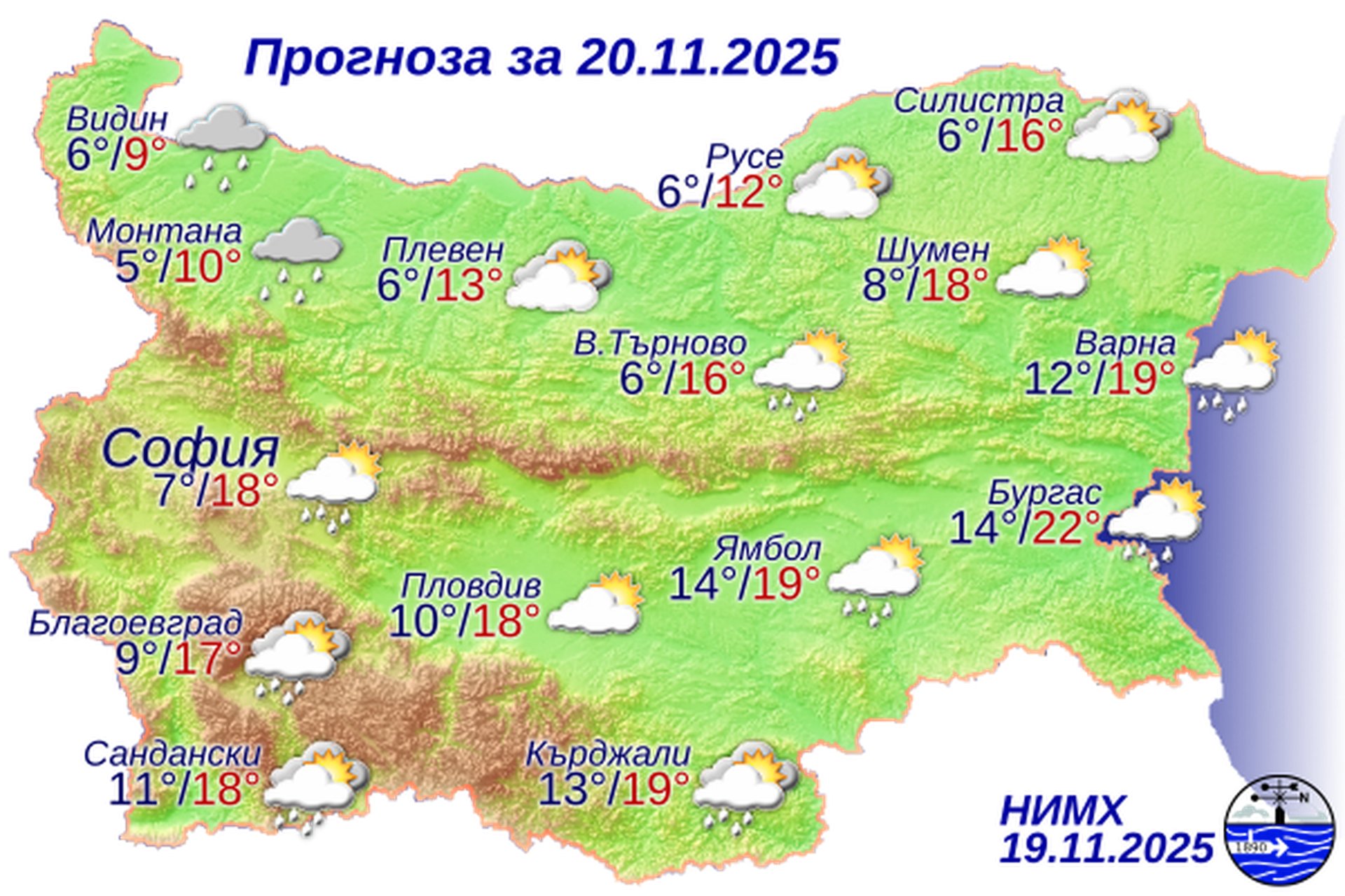 През следващото денонощие времето в страната ще е предимно облачно на места с валежи от дъжд, по-значителни в Югозападна България и в крайните южни райони на Източните Родопи. През деня облачността временно ще намалява и валежите ще спират. Вятърът в котловините и низините временно ще стихва и там преди обяд видимостта ще е намалена. В Източна България и северно от планините ще духа умерен и силен и поривист вятър от юг-югозапад. Минималните температури ще бъдат в широки граници - между 5° и 10° в по-голямата част от страната до около 13°-15° в югоизточните райони. Максималните температури ще са предимно между 10° и 15°, в Южна България и местата чувствителни на южния вятър до около 20°-22°. В София минималната температура ще бъде около 7°, а максималната - около 18°.