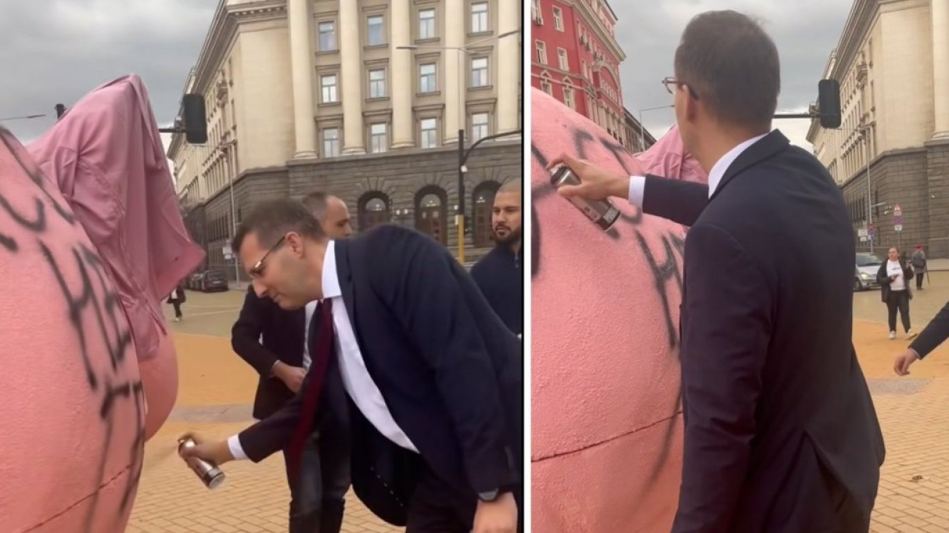 Депутатът от ДПС-НН Станислав Анастасов надраска със спрей инсталацията "Прасe касичка", която беше поставена пред централния вход на Народното събрание. На видеа в социалните мрежи се вижда как Анастасов, заобиколен от още няколко представители на партията, пише по прасето.