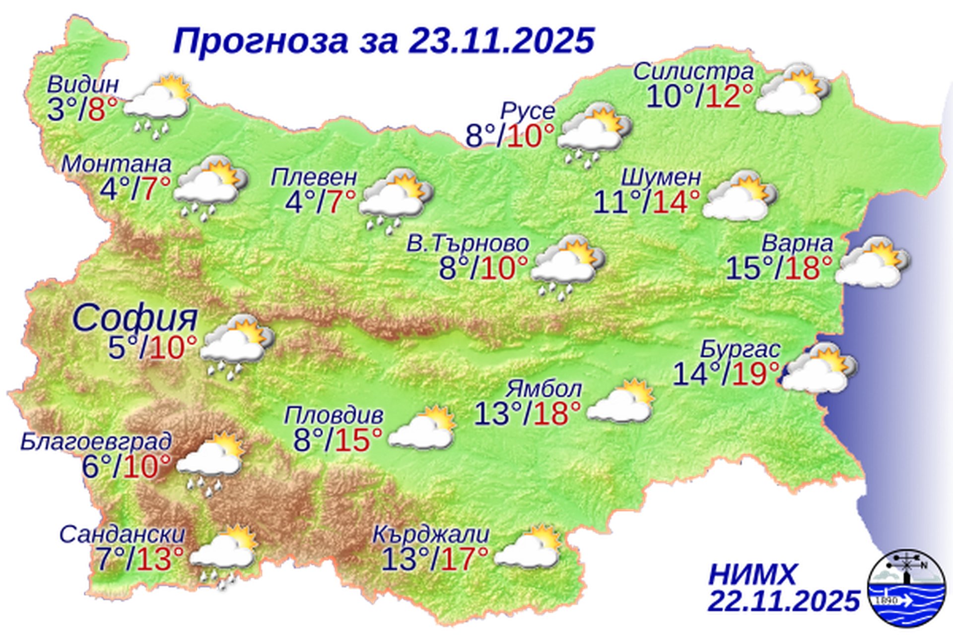 През нощта облачността над страната ще бъде значителна. Валежи от дъжд ще има в Западна и Централна Северна България. Минималните температури ще бъдат между 3° и 8°, в Източна България - между 10° и 15°, за София - около 5°. Утре в страната от северозапад ще навлиза студен въздух. Над повечето райони ще се задържи предимно облачно. Отново на места в западната половина от страната с прекъсване ще вали дъжд, а през втората половина на деня и в Североизточна България. Привечер в планинските райони на Западна България дъждът ще се примесва със сняг, но бързо ще спира. Над Южна България облачността ще се разкъсва и след обяд ще бъде предимно слънчево. Вятърът ще се ориентира от запад-северозапад и ще е до умерен. В източната част от страната ще се задържи от юг-югоизток. Максималните температури ще са от 6°-7° в северозападните райони до 18°-19° в югоизточните, за София – около 10°.
