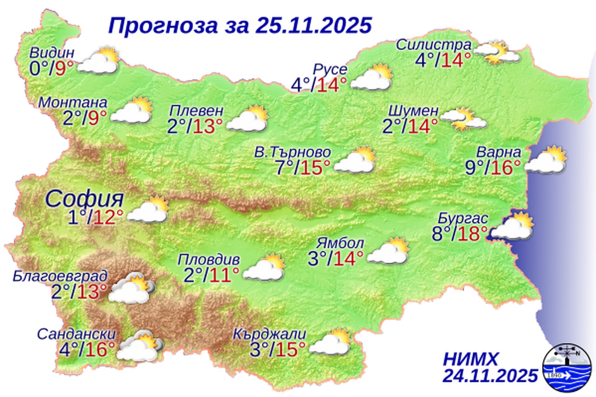 През нощта облачността от запад ще започне да се увеличава и до сутринта ще обхване и централните райони от страната. Ще се задържи без валежи. В Източна България ще духа слаб южен вятър. Преобладаващите минимални температури ще бъдат между 0° и 5°, по-високи по Черноморието – между 8° и 11°, в София – около 1° Утре над Югозападна и Източна България ще има разкъсана средна и висока облачност. Над останалата част от страната облачността временно ще намалее до слънчево. В сутрешните часове на места в равнинната част от страната видимостта ще е намалена. Вятърът от юг ще се усили. Почти тихо ще остане в Дунавската равнина и западните райони на Горнотракийската низина. Максималните температури ще са предимно между 10° и 15°, в София – около 12°.