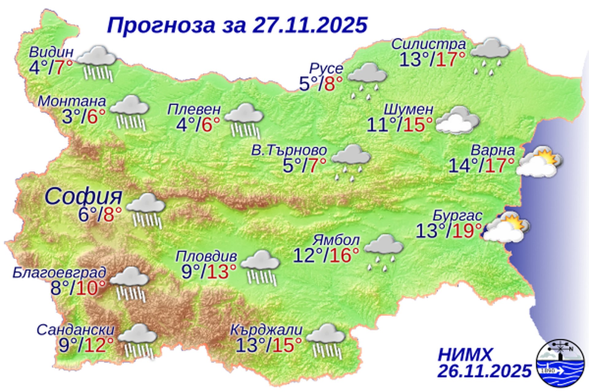 По Черноморието ще бъде облачно и ветровито, но ще е без валежи. Ще духа умерен и временно силен южен вятър. Максималните температури ще бъдат между 17° и 20°. Температурата на морската вода е 15°-16°. Вълнението на морето ще бъде 2-4 бала.
