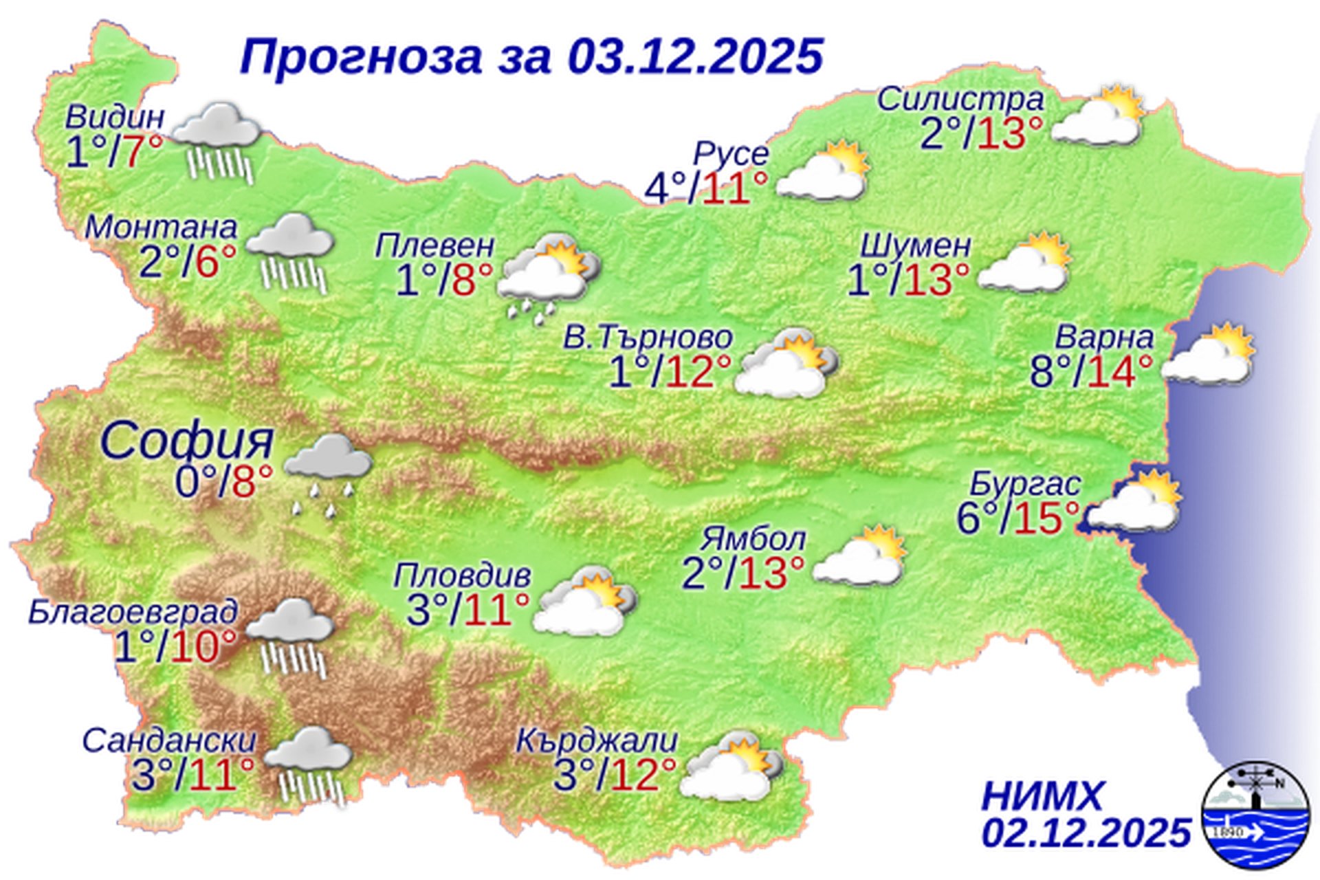 През следващото денонощие в по-голямата част от страната ще бъде предимно облачно и главно в следобедните и вечерните часове на места в Западна България ще превали дъжд. По-значителни разкъсвания и намаления на облачността ще има над Източна България. През нощта ще бъде тихо и в сутрешните часове на места в низините, котловините и по долините на реките ще се образува мъгла. През деня ще духа слаб вятър от изток, в Източна България до умерен от юг-югоизток. Минималните температури ще бъдат между минус 1° и 4°, по крайбрежието на морето по-високи, а максималните - между 9° и 14°, по-ниски в Северозападна България. В София минималната температура ще бъде около 0°, а максималната – около 8°.
