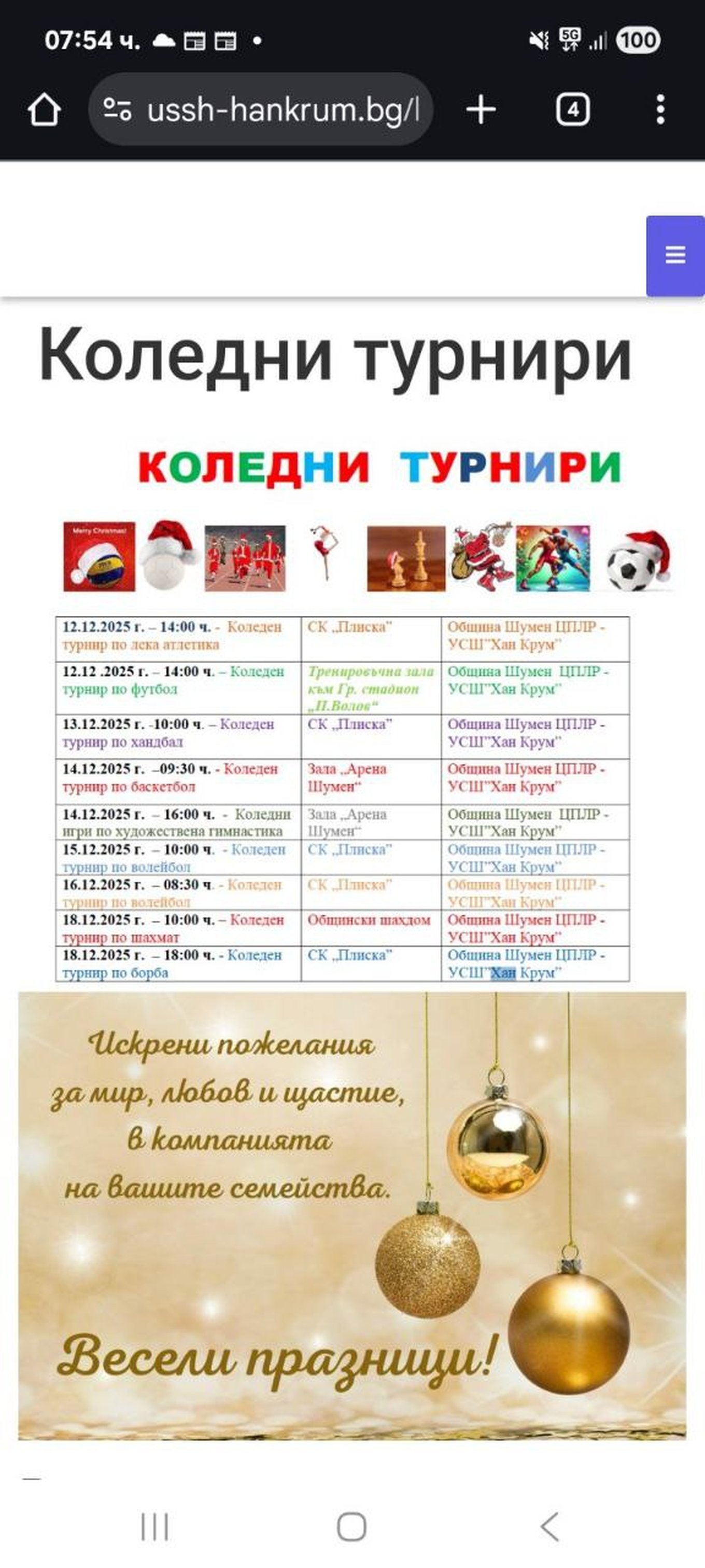 Коледни турнири по спортовете борба, волейбол, баскетбол, гимнастика, шах, лека атлетика, хандбал организира за възпитаниците си Ученическа спортна школа “Хан Крум”. Надпреварите ще се проведат от 12 до 18 декември.