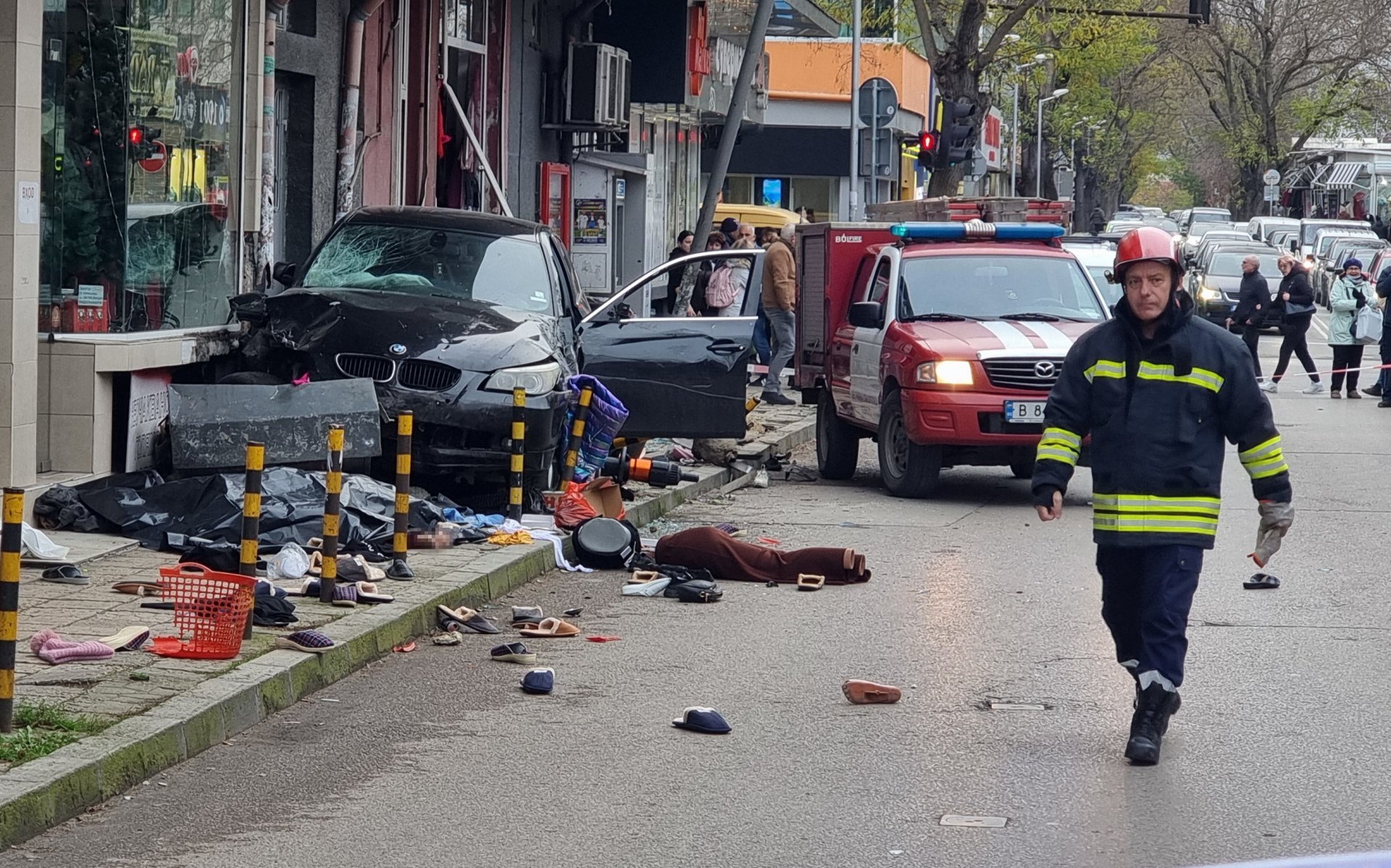 По данни на очевидци водачът на черен автомобил BMW е изгубил контрол над превозното средство, което се качило върху тротоара, разбивайки витрина на магазин и блъскайки пешеходци. Има данни, че шофьорът минал бързо по ул. "Дрин" на жълт светофар, предава Moreto.net.