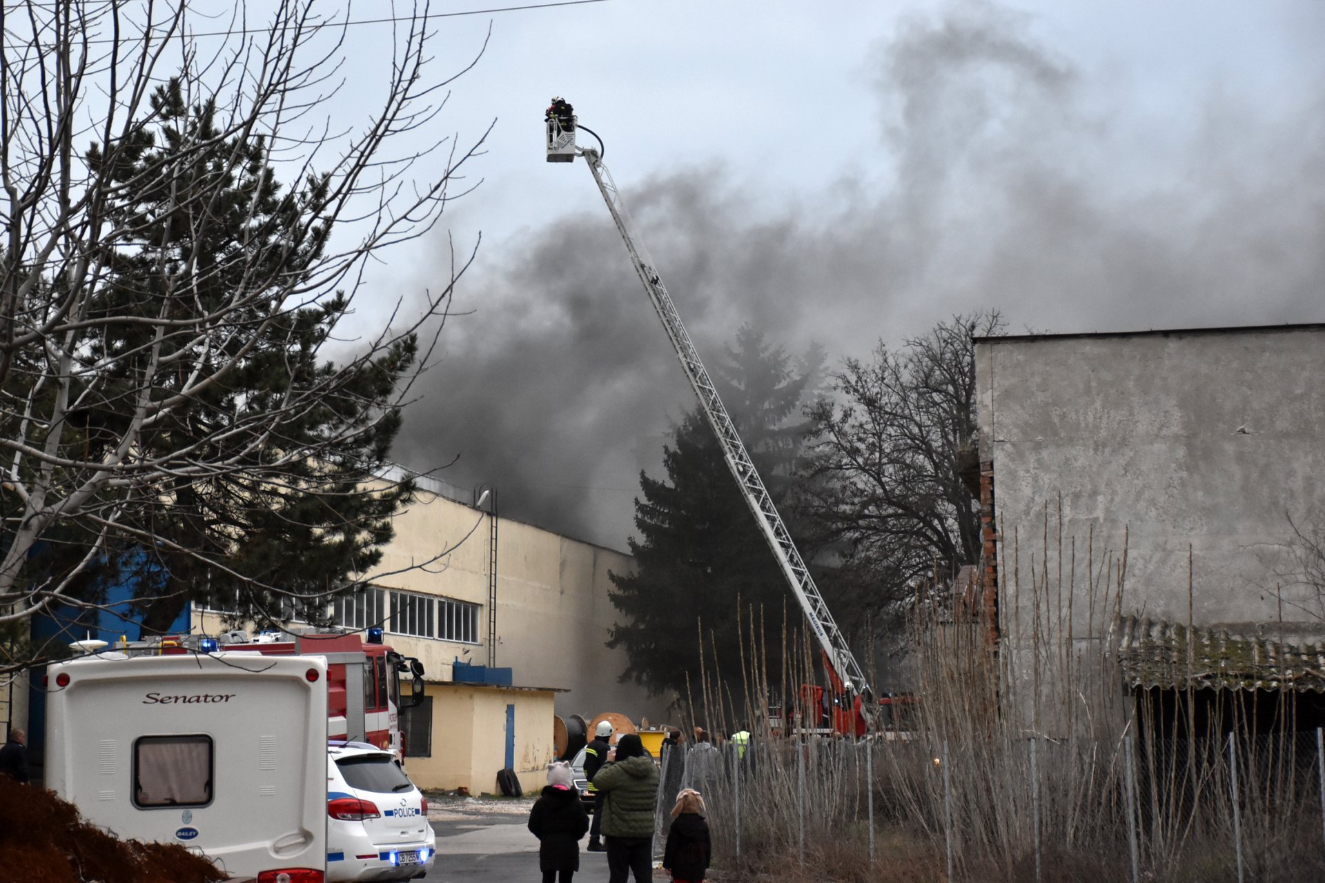 Пет противопожарни автомобила са на място. Те разполагат и със специална стълба, която да осигури достъп до подпокривното пространство, където гори. Усилията на огнеборците са насочени към това пламъците да не стигнат до помещенията, в които са складирани фотоволтаични съоръжения - лесно запалими и опасни.