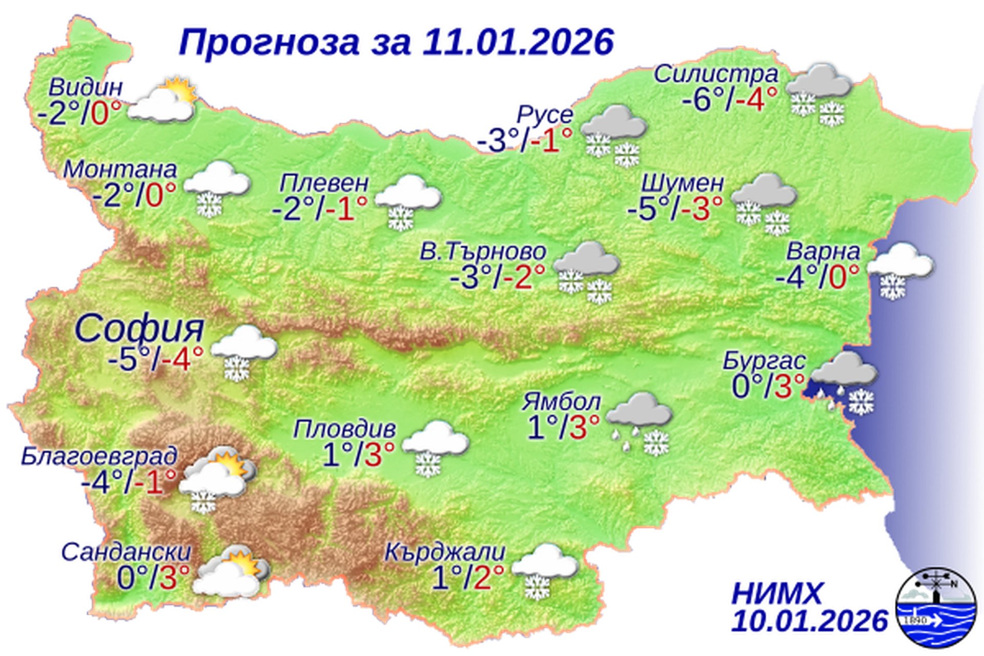 По Черноморието ще бъде облачно, ветровито и с валежи от сняг, по южното крайбрежие - от дъжд. Ще духа умерен до силен вятър от север-североизток, по-късно през деня - от северозапад. Максималните температури ще бъдат от минус 2° на север до 4° на юг. Температурата на морската вода е 9°-11°. Вълнението на морето ще бъде 2-4 бала.