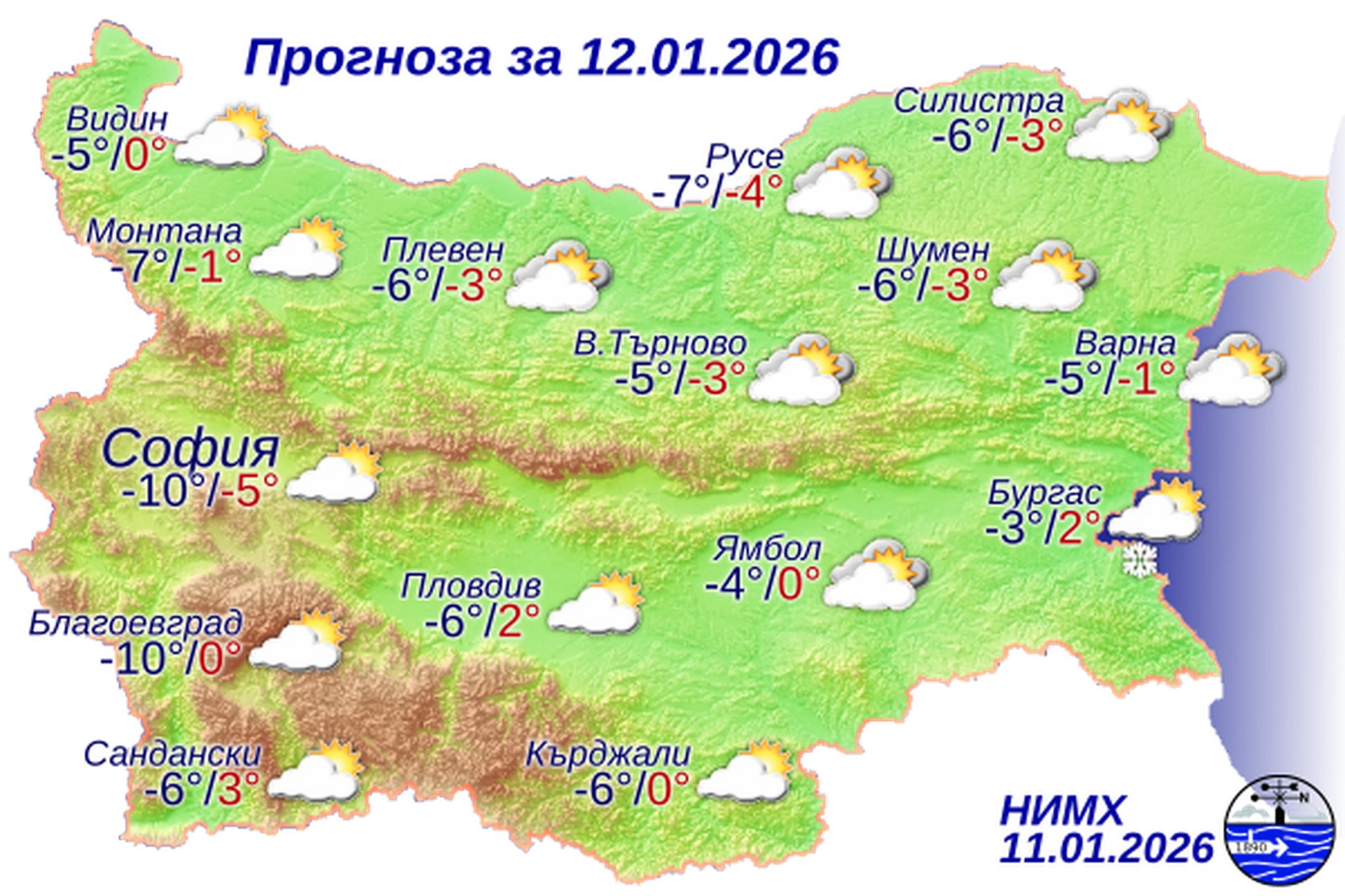 През нощта от северозапад облачността ще се разкъсва, но ще остане значителна. На места в източната половина от страната все още ще има валежи от сняг, но до сутринта валежите навсякъде ще спрат. Ще духа умерен, в Дунавската равнина, по долината на Струма и в западната част на Горнотракийската низина временно силен северозападен вятър. Минималните температури ще бъдат между минус 10° и минус 5°, в София – около минус 10°. Утре облачността ще е променлива, над много райони намаляваща до незначителна. Ще остане ветровито с умерен, в Северна България, по долината на Струма и в западната част на Горнотракийската низина и временно силен северозападен вятър. Максималните температури в по-голямата част от страната ще останат отрицателни, между минус 6° и минус 1°, в София – около минус 5°. В Горнотракийската низина и крайните югозападни райони максималните температури ще са малко над нулата.