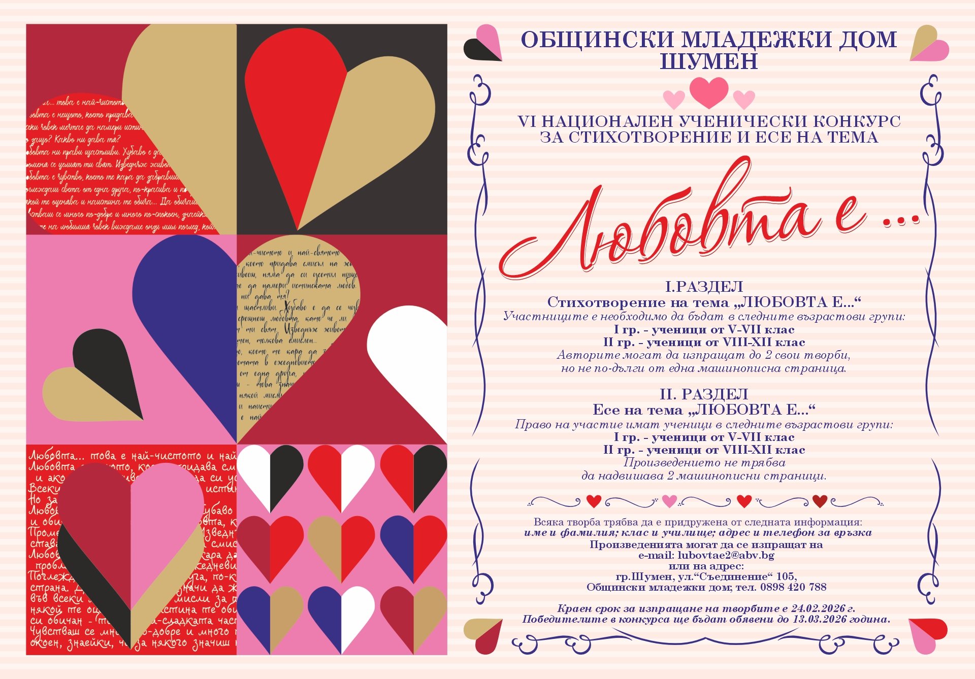 Общински младежки дом - Шумен кани млади автори да се включат в VI Национален ученически конкурс за стихотворение и есе на тема „Любовта е …“ .