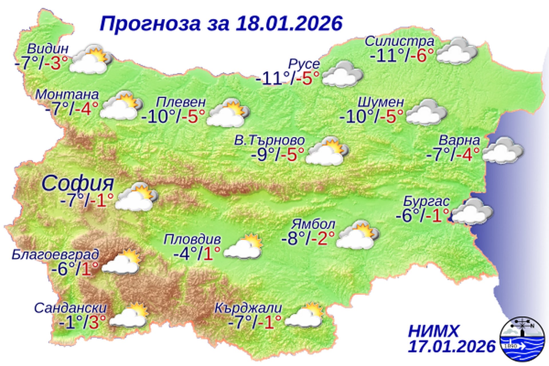 По Черноморието ще преобладава облачно време. Валежи от сняг ще има по Южното Черноморие. Ще духа умерен и временно силен северен вятър. Максималните температури ще бъдат от минус 4°-минус 3° по северното крайбрежие до минус 2°-0° по Южното. Температурата на морската вода е 8°-10°. Вълнението на морето ще бъде 3-4 бала.