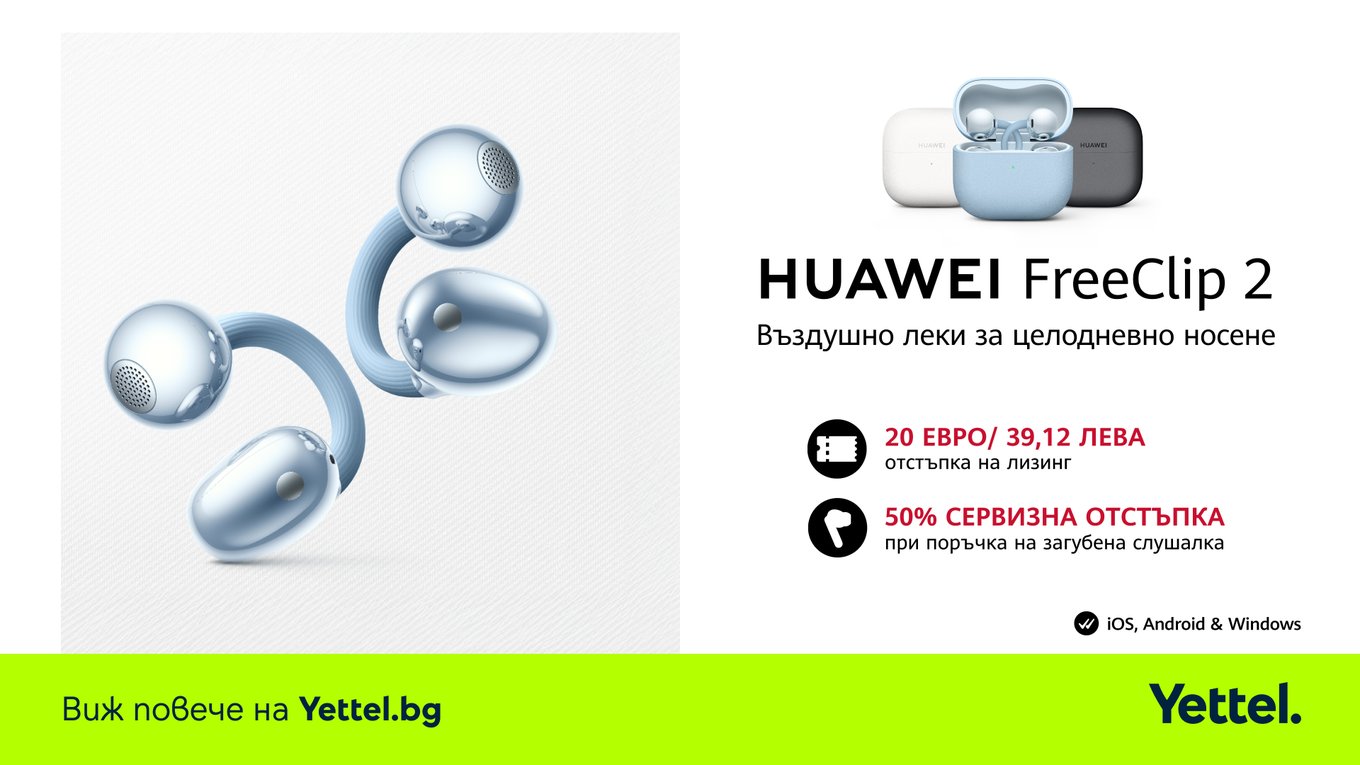 Слушалките разполагат с IP57 защита от прах и вода и са съвместими с iOS, Android и Windows, което ги прави надежден и универсален избор. Налични са в три цвята – бял, черен и син, така че да паснат на различни визии и предпочитания. В рамките на кампанията всеки клиент закупил HUAWEI FreeClip 2 ги получава с 20 евро / 39,12 лв. по-малко от стандартната цена на продукта, както и 50% сервизна отстъпка при поръчка на загубена слушалка чрез оторизиран сервизен център на Huawei, валидна за първите 12 месеца след покупката.