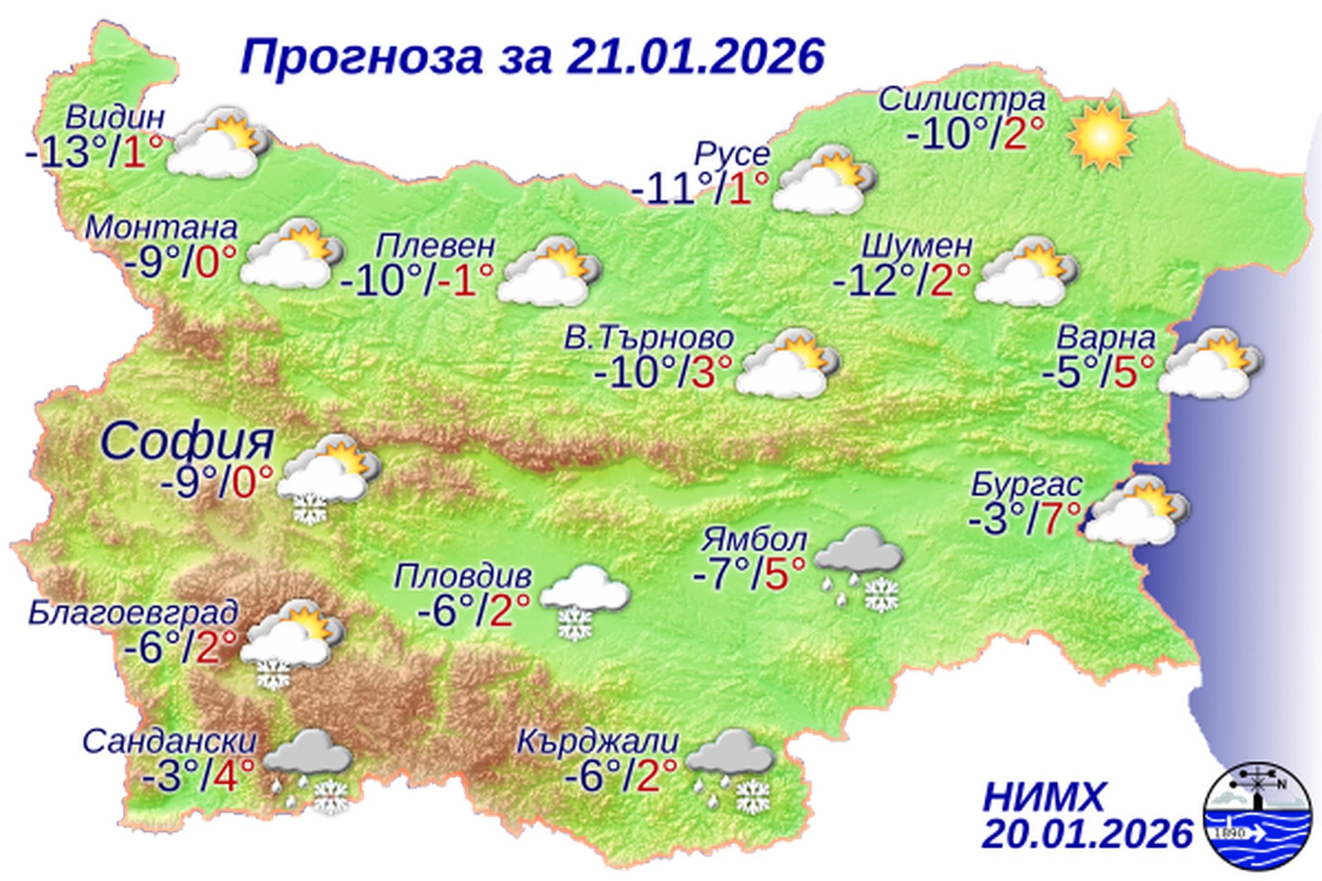 През нощта облачността ще продължи да се увеличава, най-късно в североизточните райони. Ще духа слаб югоизточен вятър. Минималните температури ще бъдат между минус 9° и минус 4°, по-ниски в североизточните райони. В София ще бъде около минус 9°. Ще духа слаб югоизточен вятър. Минималните температури ще бъдат между минус 9° и минус 4°, по-ниски в североизточните райони. В София ще бъде около минус 9°. Утре ще е облачно. Около обяд от югозапад ще започнат валежи от сняг, които до вечерта ще обхванат по-голямата част от Южна България и Централен Предбалкан. Значителни ще бъдат валежите в Рило-Родопската област. Ще духа слаб до умерен вятър от изток-югоизток и температурите в източната половина от страната ще се повишат, при което снегът в източната част от Горнотракийската низина и Източните Родопи, а през нощта срещу четвъртък и в централната част от Дунавската равнина, ще премине в дъжд и там ще се образува поледица. Максималните температури ще са между 0° и 5°, в София – около 0°.