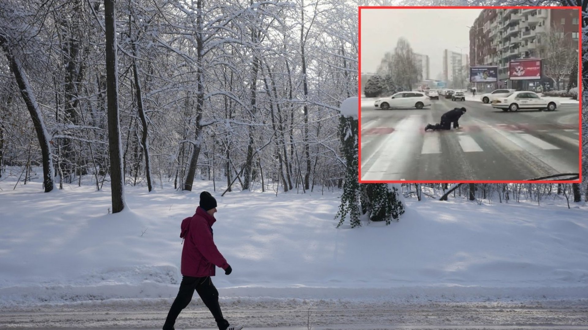 Необичайна сцена стана хит в медиите и социалните мрежи в Република Северна Македония днес - заради заледените улици в Скопие, гражданин е забелязан да пълзи на пешеходна пътека на булевард "Яне Сандански" в община Аеродром.