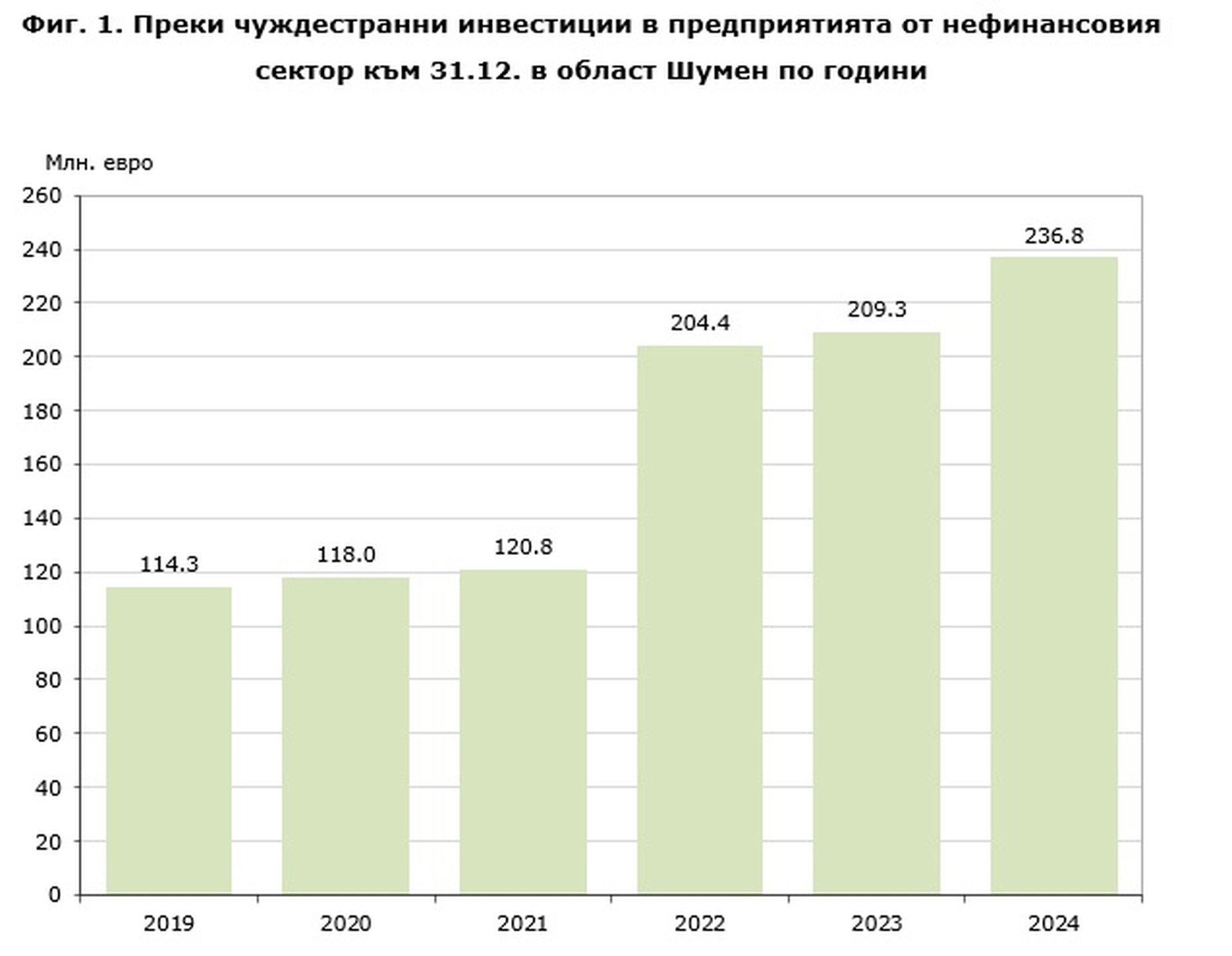 С 13,1% са нараснали преките чуждестранни инвестиции (ПЧИ) в нефинансовия сектор в област Шумен за една година. В края на 2024 г. ПЧИ възлизат на 236.8 млн. евро, съобщиха от Статистически изследвания – Шумен.