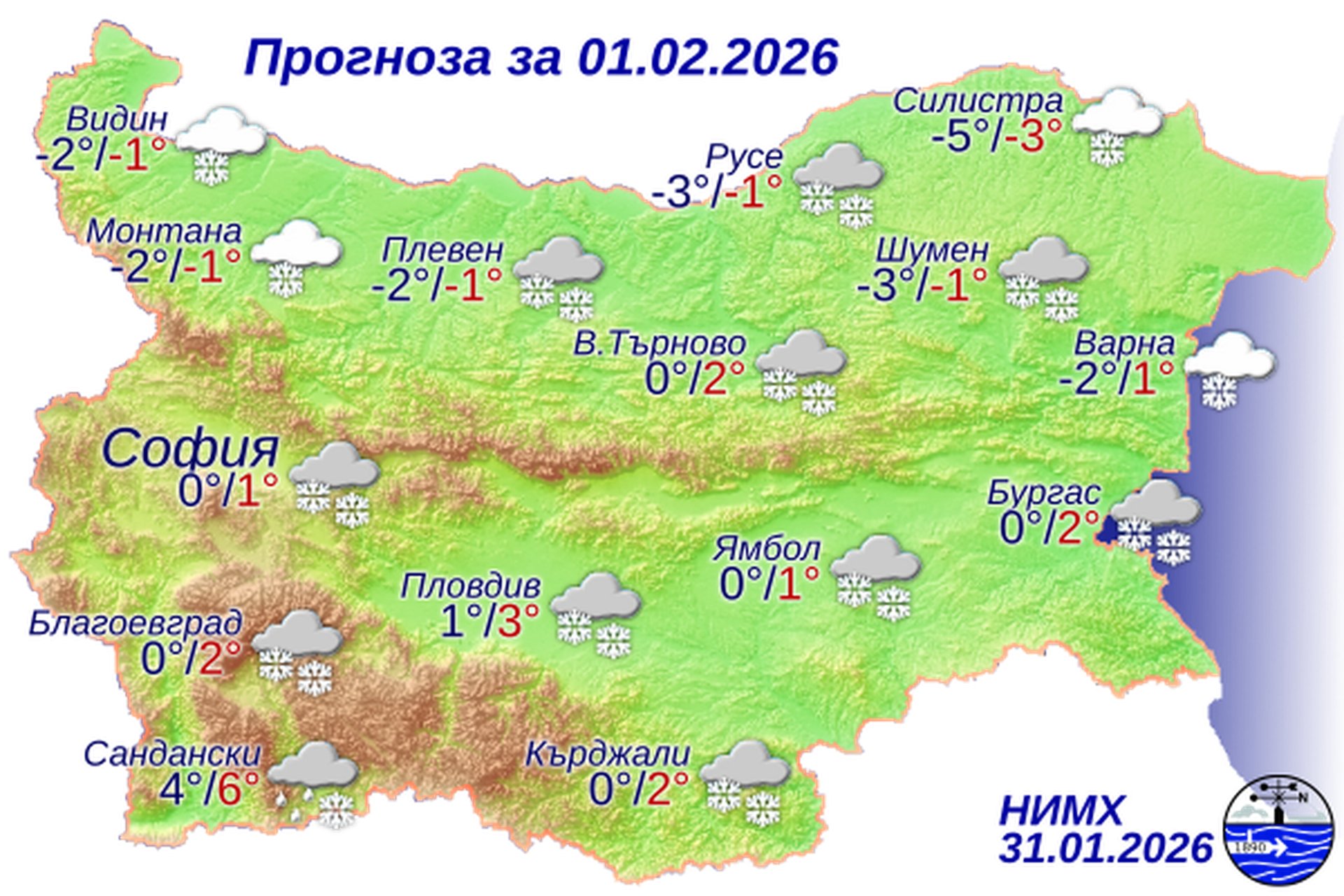 Утре още сутринта от югозапад ще започнат валежи от сняг, които до вечерта ще обхванат цялата страна и в повечето райони ще са интензивни и значителни по количество. Вечерта и през нощта срещу понеделник интензивни снеговалежи ще има и в Североизточна България. Ще се образува снежна покривка, в Южна България достигаща 15-20 cm, а в Северна – до 10-15 cm. Ще духа умерен, в Източна България временно силен североизточен вятър, с който ще нахлува студен въздух. Ще има снежни виелици и навявания. Температурите ще са почти без денонощен ход, предимно между минус 3° и 2°, в София 0°-1°.