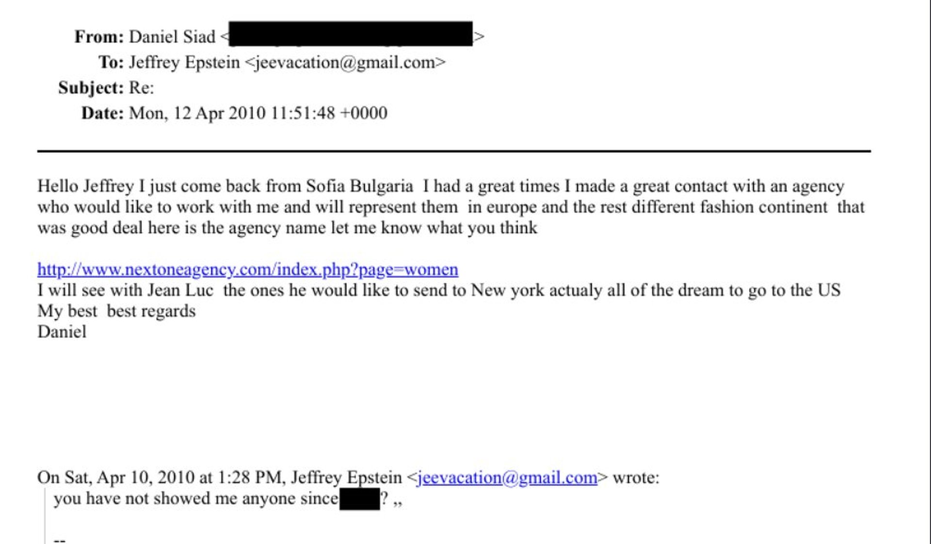 "Здравей, Джефри. Тъкмо се върнах от София, България, прекарах си чудесно. Свързах се с агенция, която иска да работи с мен и ще ги представлявам в Европа... Ще видим с Жан-Люк кои иска да изпрати в Ню Йорк. Всъщност всички мечтаят да дойдат в Щатите", пише Сиад.