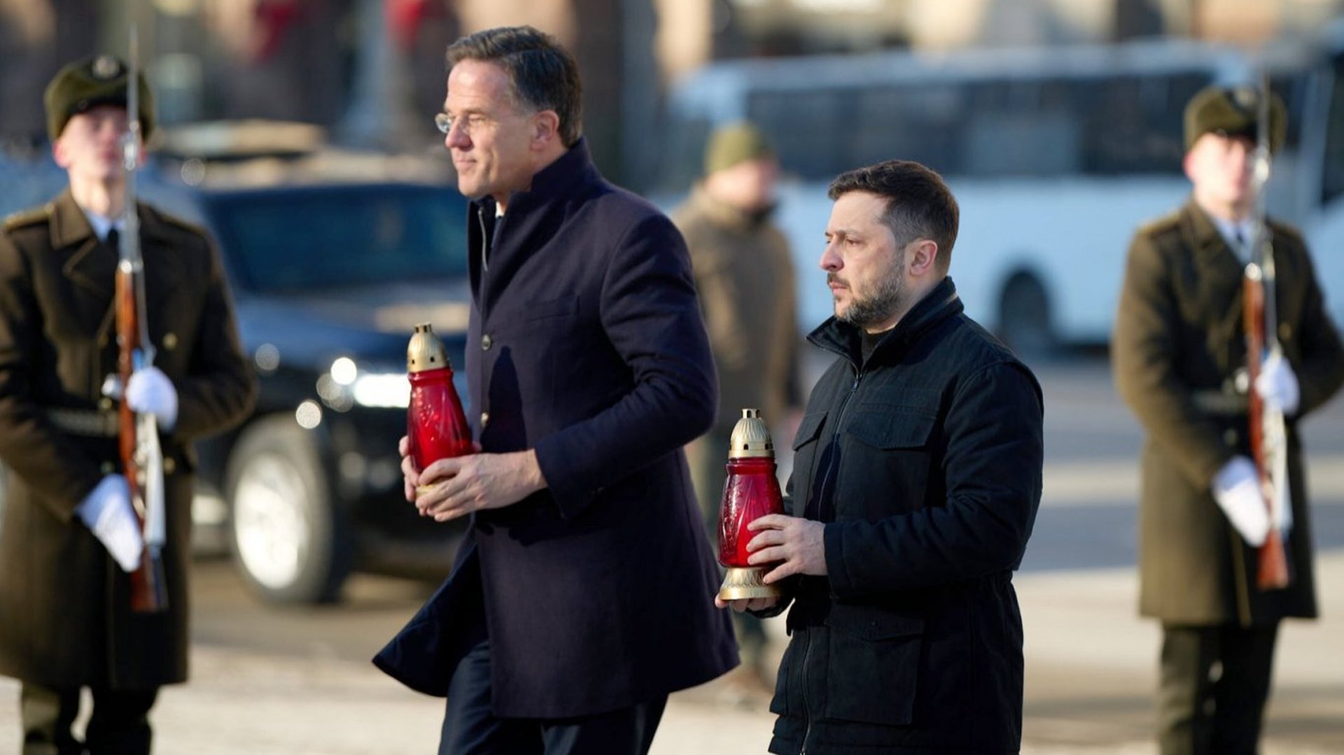 Преди речта генералният секретар и украинският президент Володимир Зеленски поставиха свещи пред импровизиран паметник на загиналите от началото на руското нашествие войници, намиращ се на централен площад в Киев, показва видеоклип, публикуван от Зеленски в социалните мрежи.