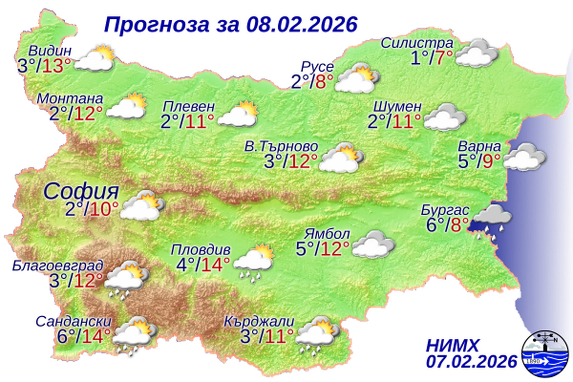 По Черноморието ще преобладава облачно, на места и мъгливо време. Слаби превалявания от дъжд ще има главно по южното крайбрежие. Ще духа слаб северозападен вятър. Максималните температури ще бъдат 7°-9°. Температурата на морската вода е от 5°-6° по Северното Черноморие до 7°-8° по Южното. Вълнението на морето ще бъде 1-2 бала.