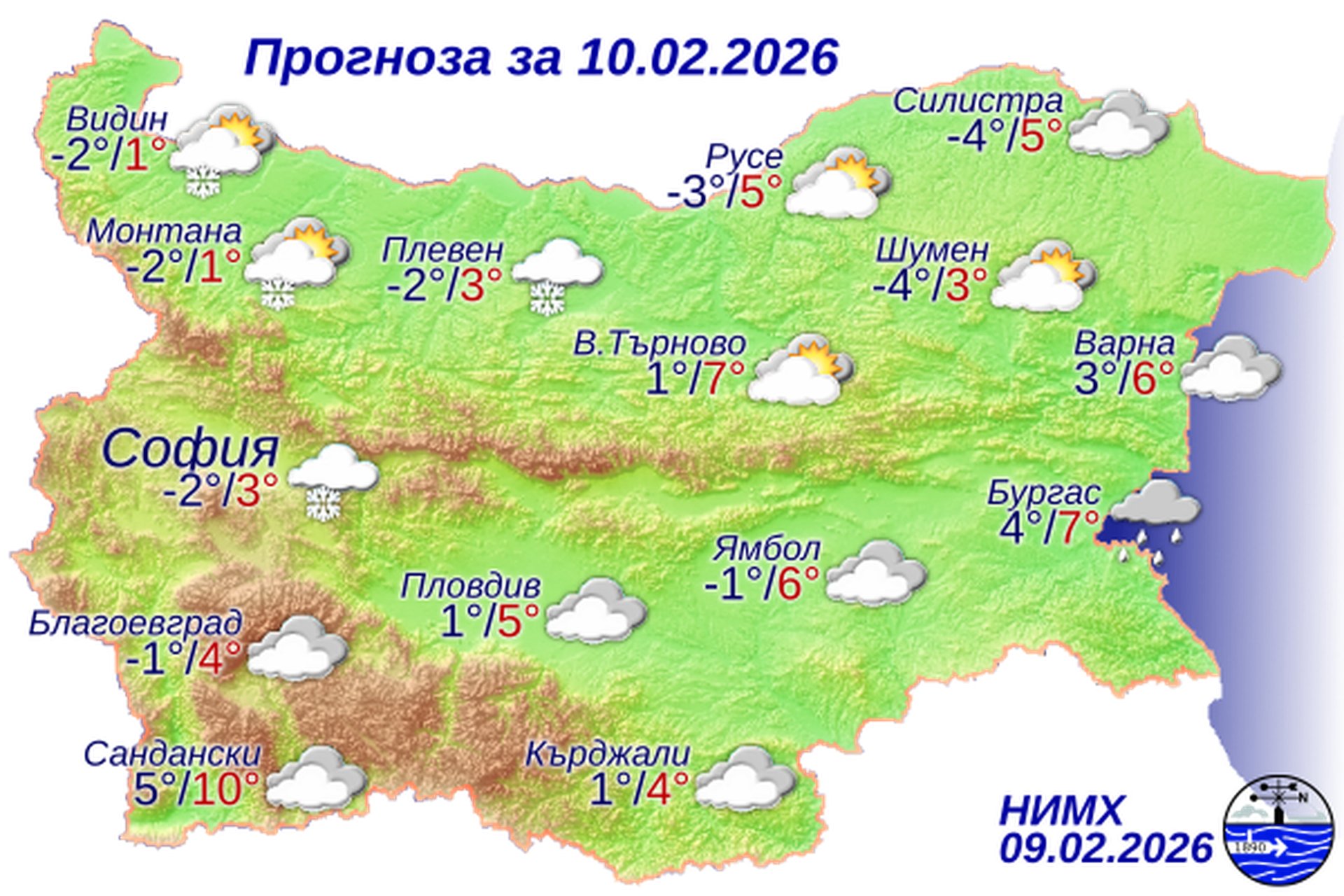 През нощта облачността ще е значителна, в западната половина от страната и в североизточните райони с превалявания от сняг, а по Южното Черноморие – от дъжд. На места, главно в западните части от Дунавската равнина и Горнотракийската низина ще е с намалена видимост. Ще духа слаб, в Дунавската равнина и източните райони умерен вятър от изток-североизток. Минималните температури ще бъдат между минус 4° и 1°, по Черноморието и в крайните югозападни райони – около 3°-5°, а в София – минус 2°.